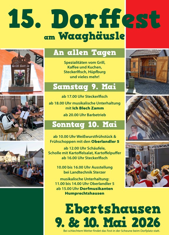 Auch in diesem Jahr wird unsere Ausstellung wieder parallel zum Ebertshäuser Waaghäuslesfest am 9. und 10. Mai stattfinden. Die Dorfgemeinschaft bewirtet Sie gerne und bietet ein großes Festprogramm an.